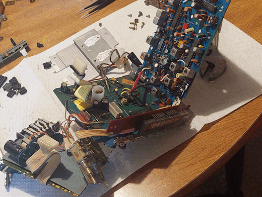 On top of all these mechanically important things, there is also one major issue that needs to be resolved. Oh God The Radio. The Fiero came with its original Delco GM radio, featuring AM/FM and a bare-bones tape deck that doesn't even feature auto-reverse. How glamorous. For authenticity (and love of VFDs), I wanted to keep this radio around. Unfortunately, it had a few major problems. First of all, it did not keep time. You could set the clock, come back 10 minutes later, and it would already be behind a couple minutes. Second, the radio did not tune. Or rather, it didn't tune to 99% of the radio spectrum. Somehow, it can only flip between the same two stations. Thirdly, the tape deck does not work. This is the most normal issue, as rubber generally does not enjoy sitting in a hot car for 40 years. Finally, it sounded a bit distorted. Almost like blown out speakers, but different enough to make the radio itself suspect. So obviously I've got my work cut out for me, but I figured with some new belts and a recap it would be just fine. Now I've never exactly done a recap job or fully refurbished a tape deck, but I'm sure it'll be fine. Obviously, the best place to start is by tearing the radio apart. This was a horrible mistake. As it turns out, the psychopaths at Delco decided that this radio and its whopping 5 PCBs needed to be mounted every which way and secured with nothing more than ribbon cables, a thin metal cage, and hope. The hope quickly disappeared, followed shortly by the thin metal cage, leaving just ribbon cables holding this mess of PCBs together.
